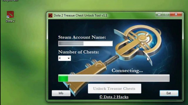 Dota 2 Treasure Chest Unlocker Tool And Keys is the latest tool which can be found on our site. It was uploaded today, and it does some miraculous things. It will unlock all the Treasure Chests, thing that will provide you with a great advantage in any battle. We think that we have done a tremendous job, it took us over 2 months to find all the exploits in their serves, but we finally managed to do it. That's why we are so proud of our team. To use it you will have to do the following: type the steam account name, which can be maximum 25 characters; sorry for the longer ones you will have to wait until we will be able to extend it to 100 characters. Choose the number of chests: from 1 to maximum and then click on unlock treasure chests. The highly coded algorithm is able to find 4 chests per second, and open them all. That's impressive, the tool thinks like a chess player. I assure you that every hack from this site, generator, or other stuffs, are 100% tested and are working like this one. That means that you can trust us. In order to enter in the possession of this hack, you will have to download it. Our hosts won't ask for money for keeping our site on. I hope this is the best method for all of us and hope you will understand this. This method is implemented to prevent those undecided gamers and bots which try to take our site down. So download the chests and key tool and enjoy it!